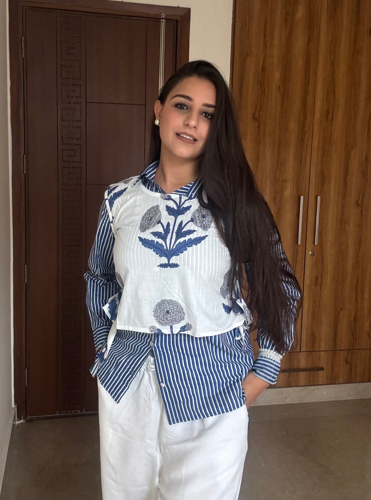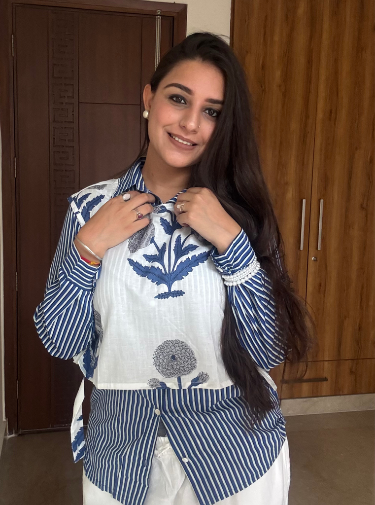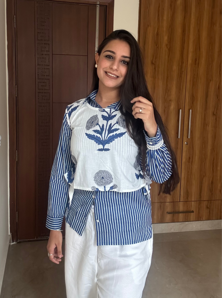 Step into effortless elegance with our unique shirt and waistcoat combo that blends classic stripes with artisanal charm. This set features a blue striped shirt crafted from breathable cotton, offering a relaxed fit and drawstring tie-up at the waist for added comfort and style. The shirt is elevated with a detachable knotted waistcoat made from soft white cotton, adorned with hand block-printed floral motifs in a striking blue hue.