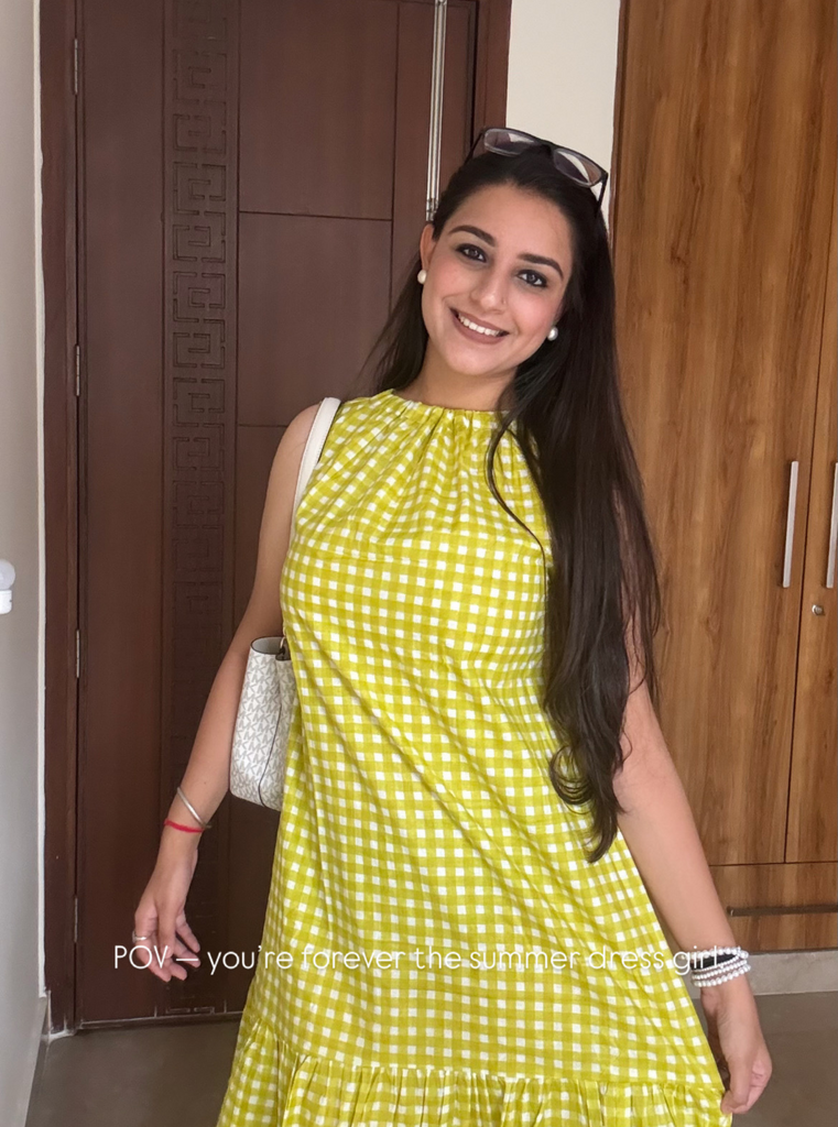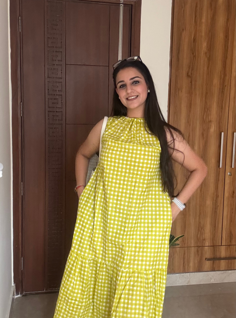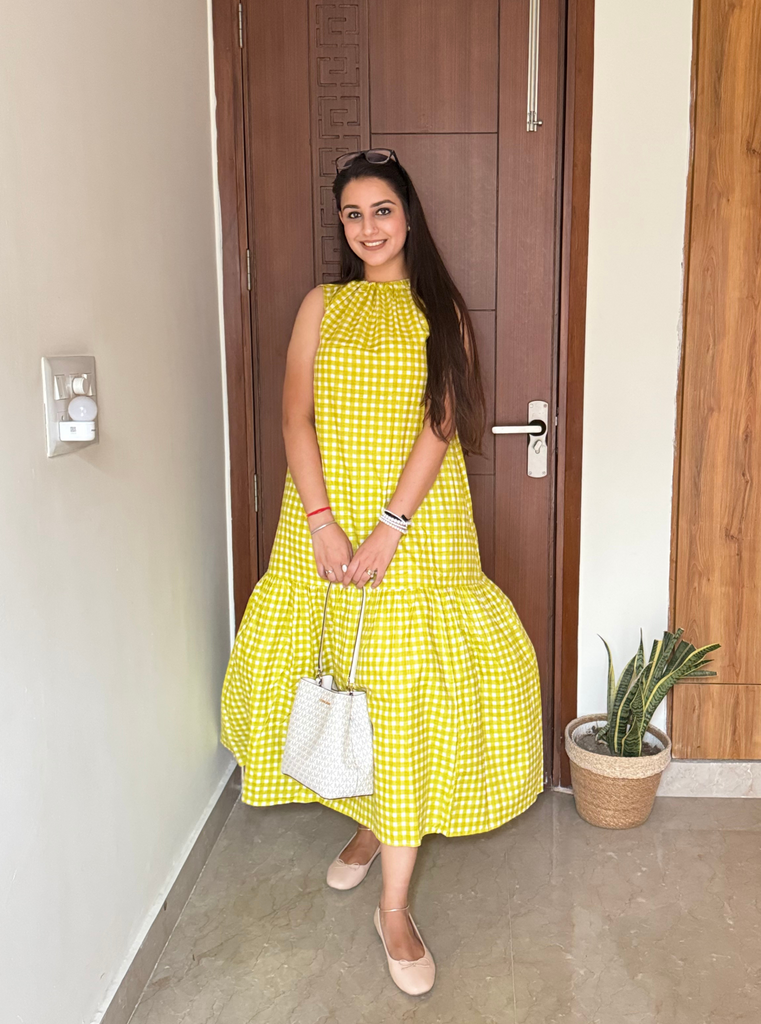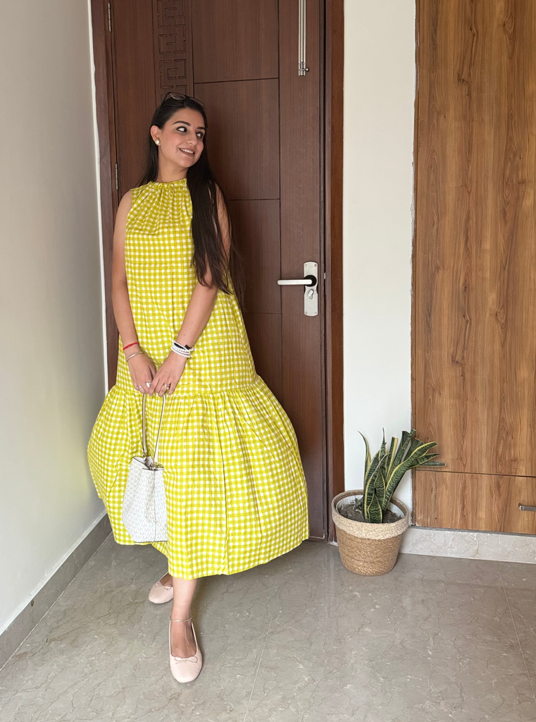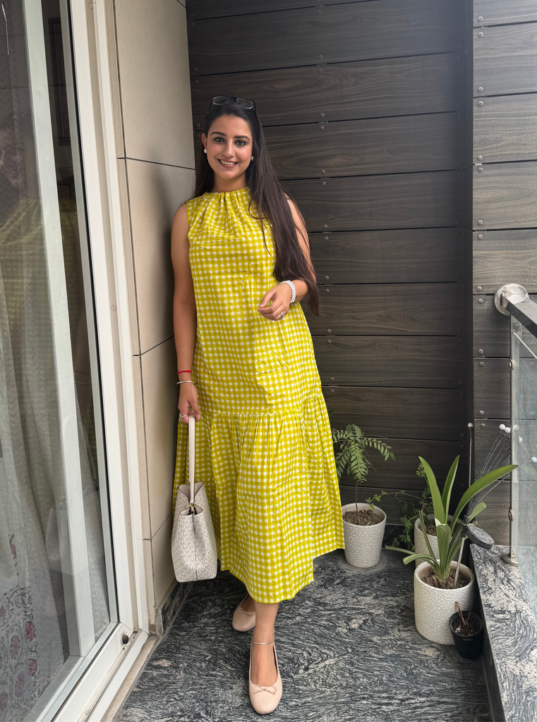 Crafted in soft, breathable mul cotton, this hand block-printed gingham dress is designed for ease, movement, and everyday elegance. The ankle-length silhouette, measuring 51 inches, features gentle gathers below the knee that create a flattering, flowy shape.