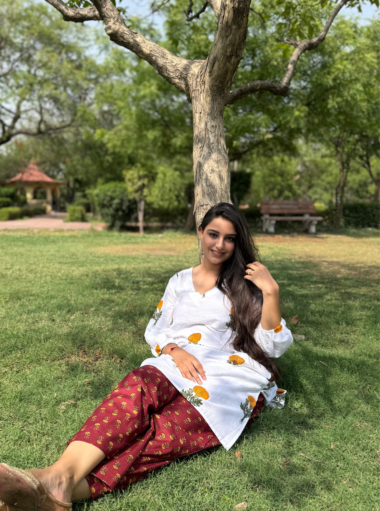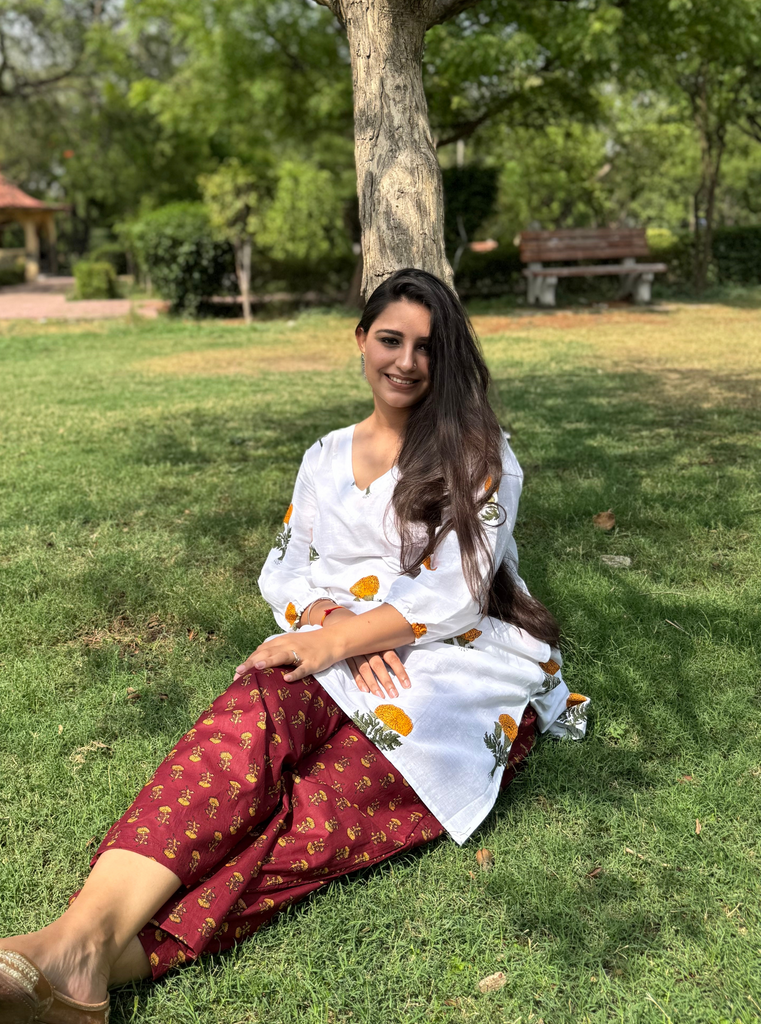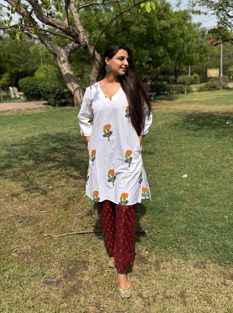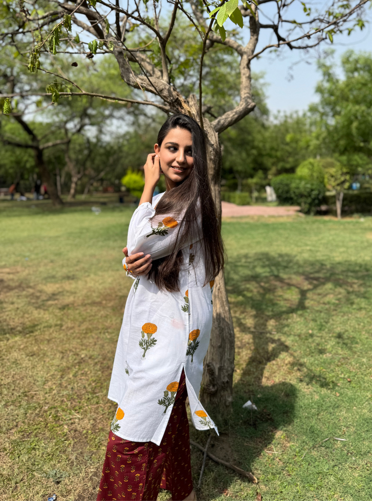Our White Marigold Block-Printed Cotton Coord Set is crafted in soft, airy mul fabric that keeps you cool and comfortable. The white A-line shirt is adorned with hand block-printed marigolds all over, featuring a classic V-neckline, full sleeves with gentle elastic at the wrists, and convenient side pockets—designed to blend function with grace.