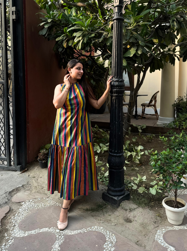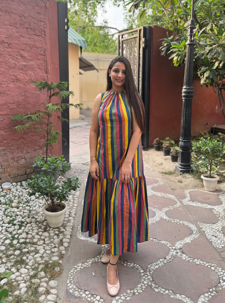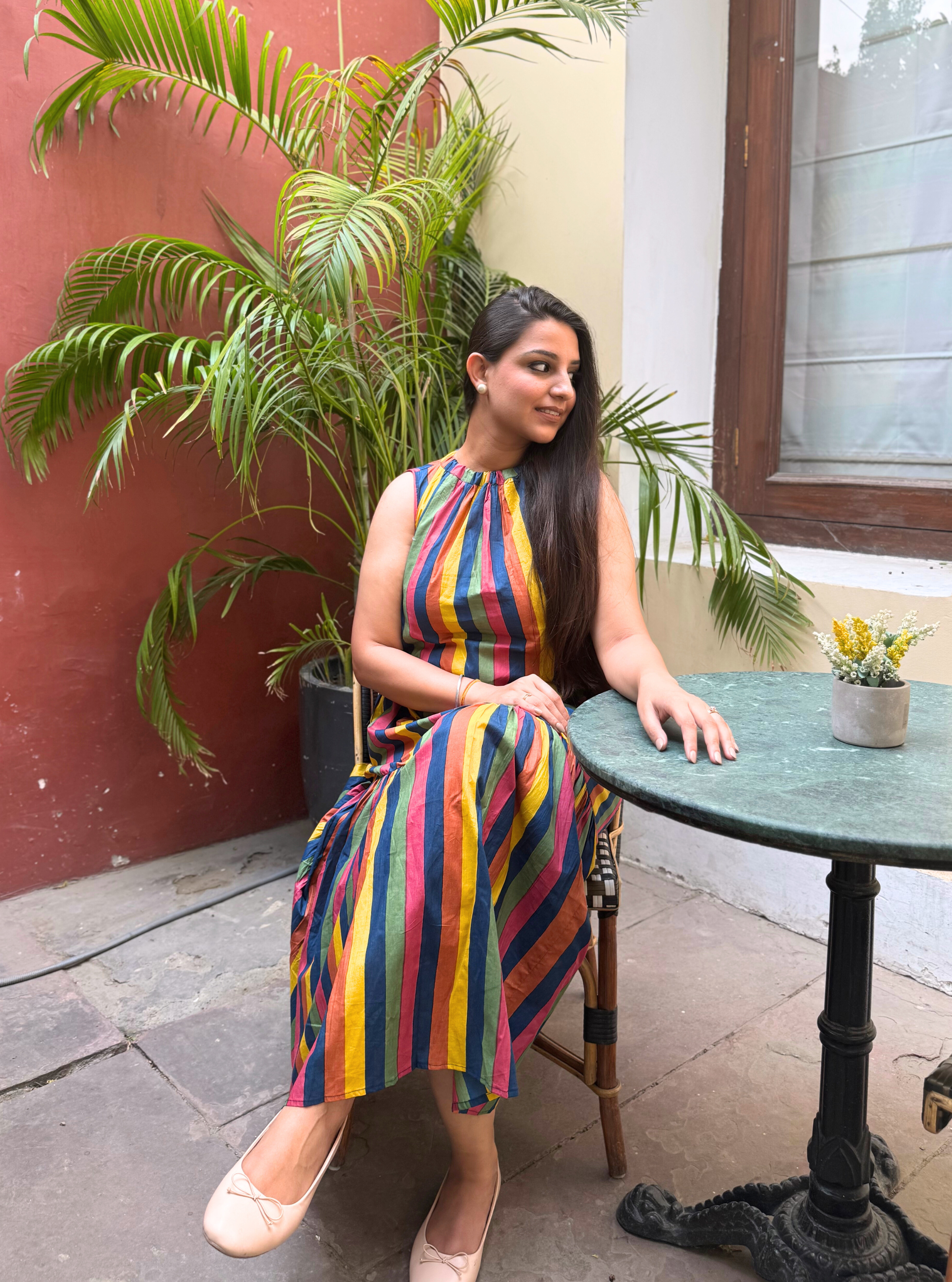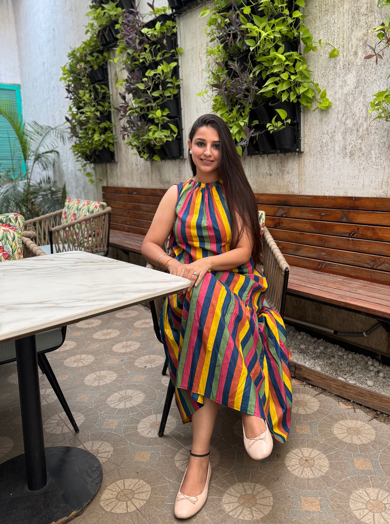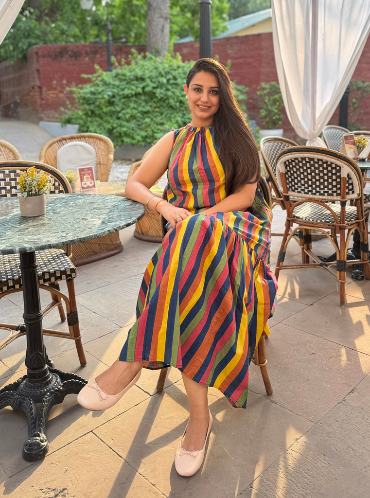 Crafted in soft, breathable mul cotton, this hand block-printed striped dress is designed for ease, movement, and everyday elegance. The ankle-length silhouette, measuring 51 inches, features gentle gathers below the knee that create a flattering, flowy shape.