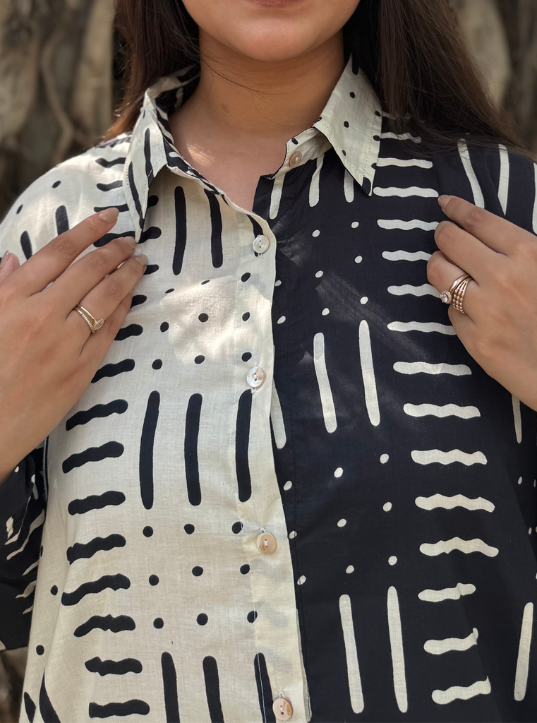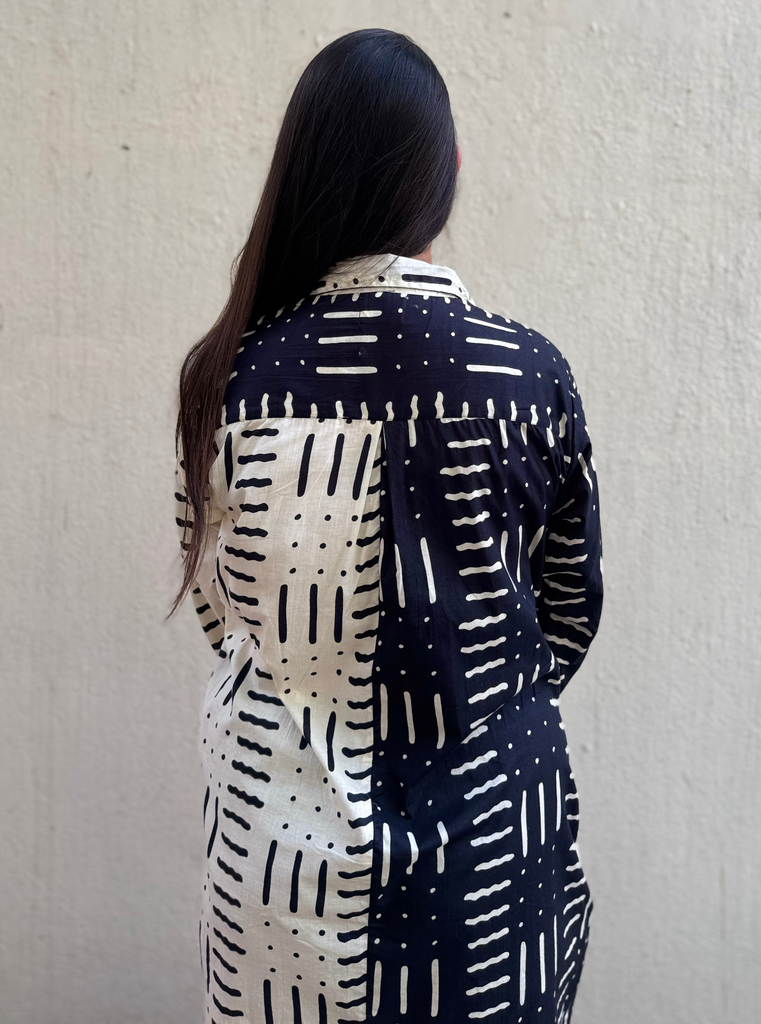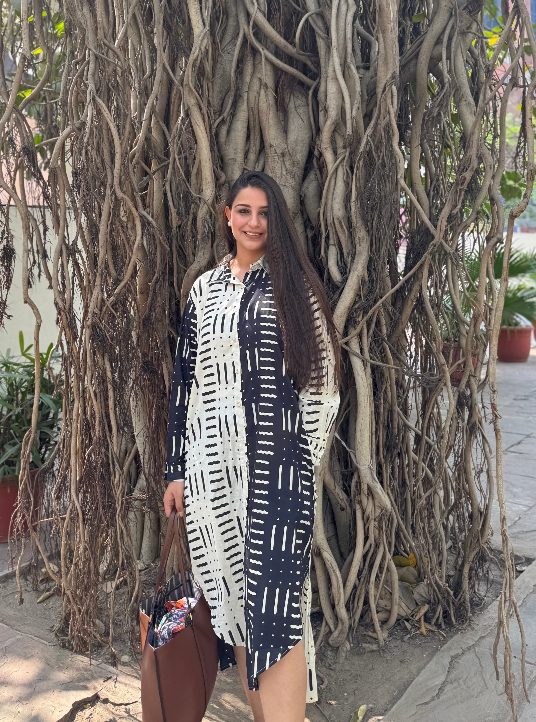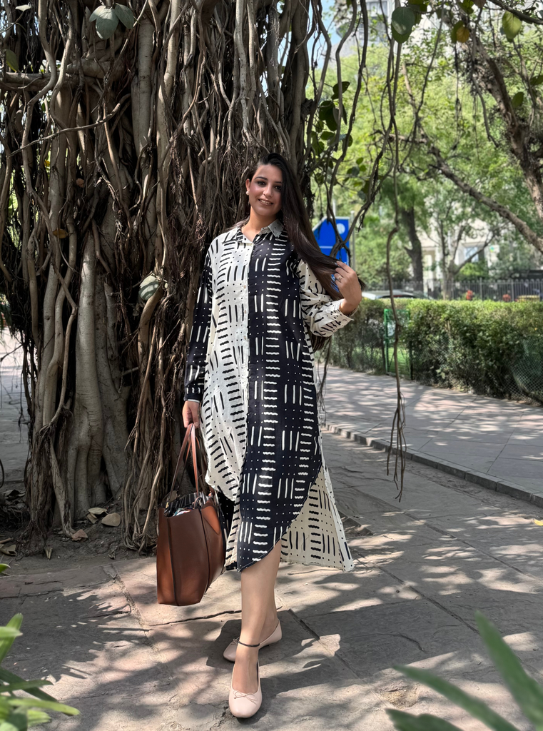 Make a bold statement with this contemporary full-sleeved button-down dress, crafted in a striking black and off-white palette. Designed with an asymmetric front & back— one half off-white and the other black — it brings a modern, graphic edge to your wardrobe. This dress features a high-low hemline with a rounded front and a straight back, offering fluid movement and clean structure.