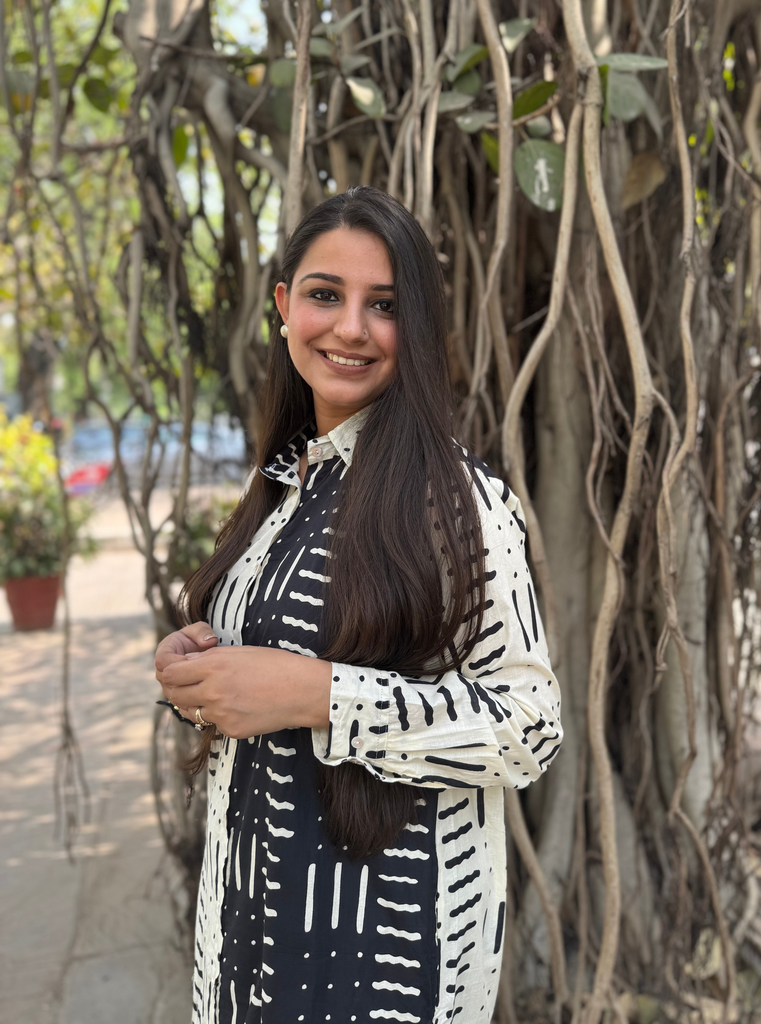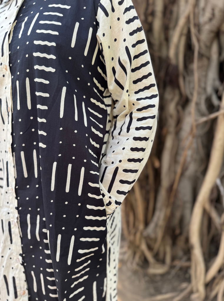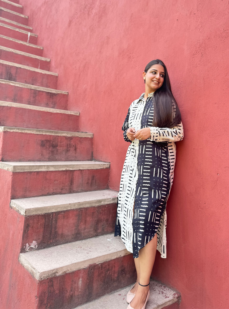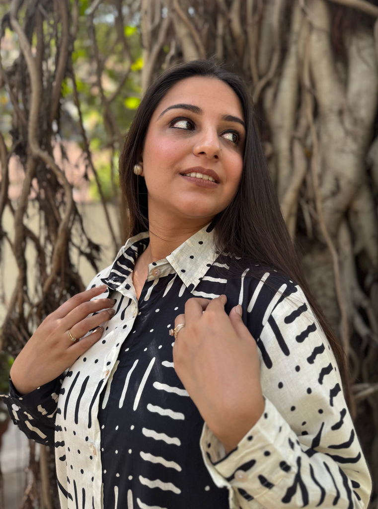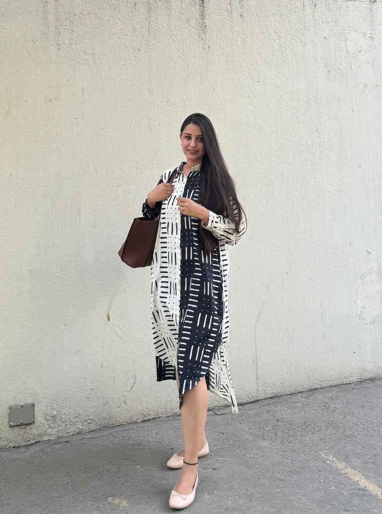 Make a bold statement with this contemporary full-sleeved button-down dress, crafted in a striking black and off-white palette. Designed with an asymmetric front & back— one half off-white and the other black — it brings a modern, graphic edge to your wardrobe. This dress features a high-low hemline with a rounded front and a straight back, offering fluid movement and clean structure.